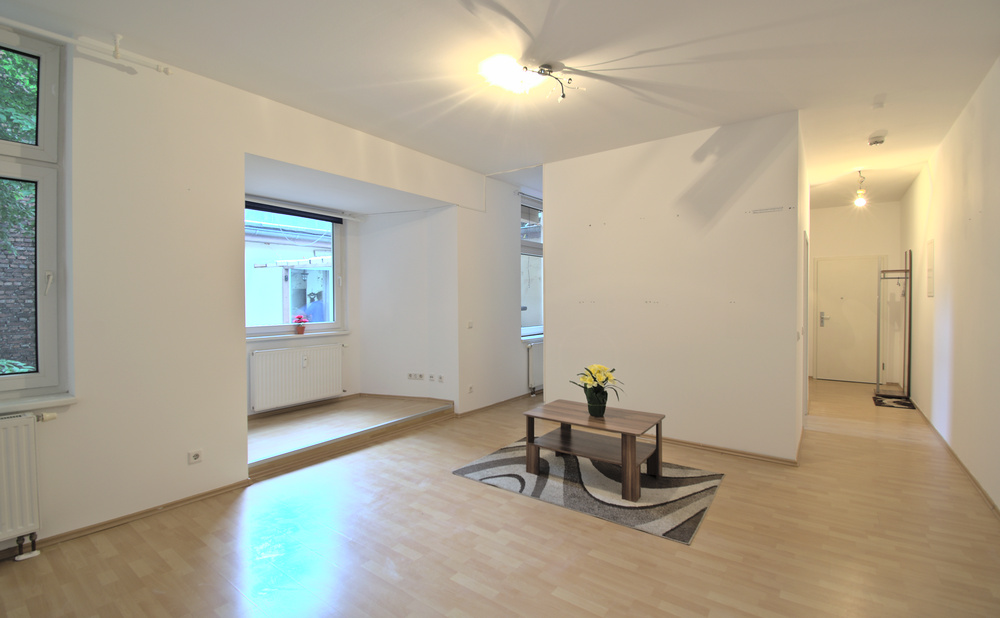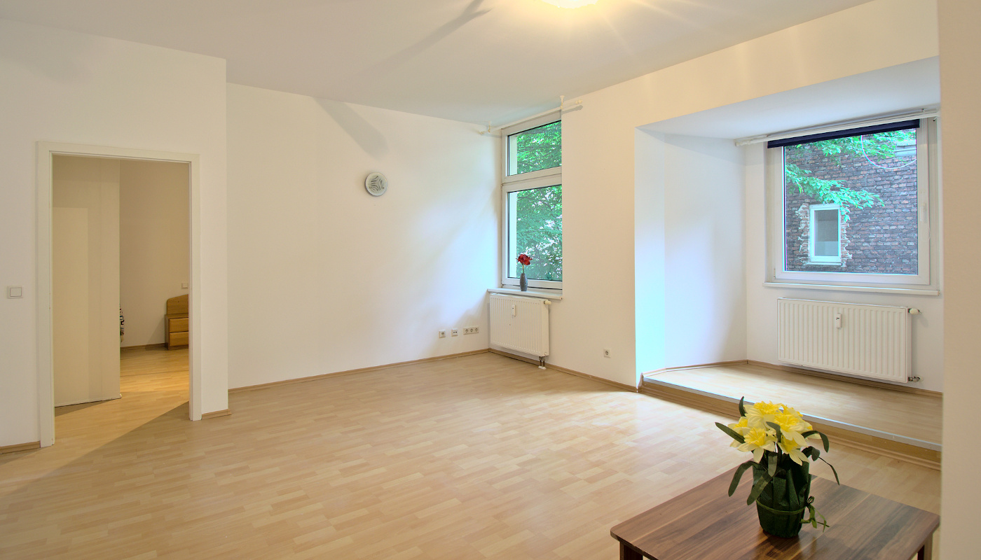 Das Wohnzimmer ist zum Flur offen und hat einen gemütlichen Erker. Hinter dem Wohnzimmer befinde sich das Schlafzimmer.