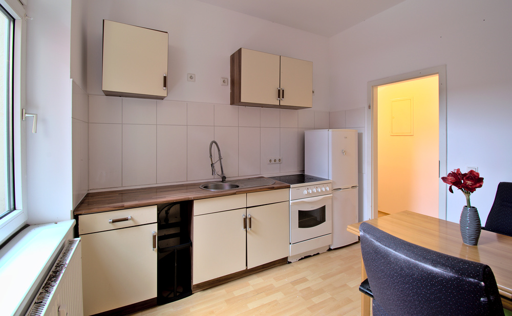 Am Flur befindet sich das Bad mit Dusche, gefolgt von der Küche, welche vom Flur und vom Wohnzimmer aus erreicht werden kann.